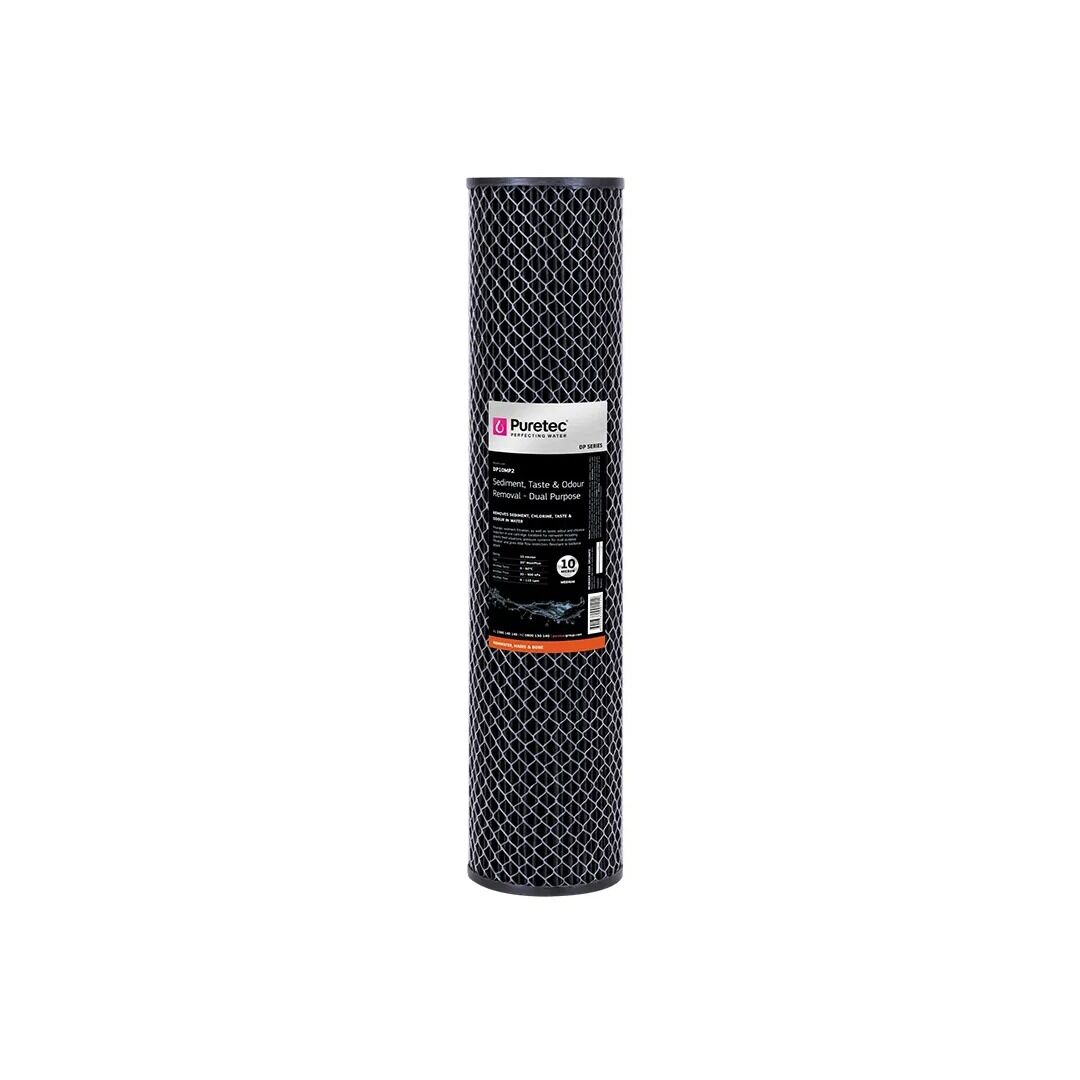The Puretec DP10MP2 Dual-Purpose long-life cartridge is constructed from a carbon-impregnated non-cellulose media. They offer sediment filtration, as well as taste, odour and chlorine taste, and odour reduction in one cartridge. Unlike cellulose cartridges, DP Series cartridges are resistant to bacterial attack allowing them to be used for non-chlorinated water applications.