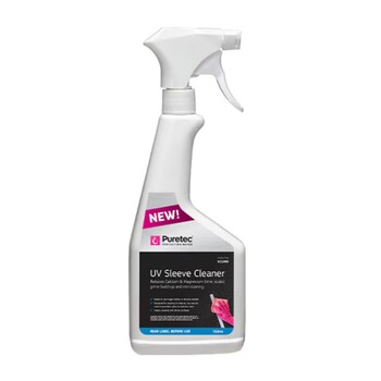 The Puretec SC1000 UV Sleeve cleaner is designed to help reduce scale build-up and staining on UV Sleeves. Supplied in a convenient spray bottle to make cleaning the glass sleeves on your UV system easier.