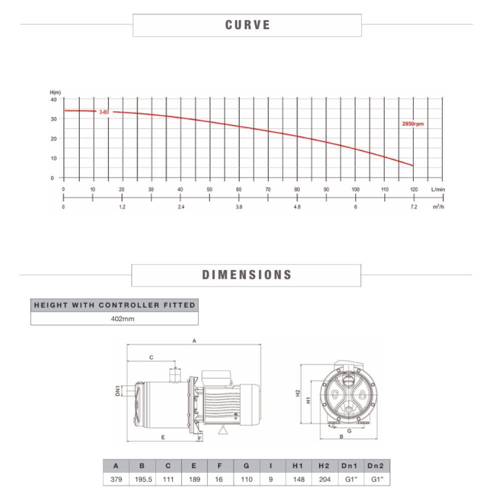 0.55kW, 0.75hp, 240V, max hd 34m max flow 120L/min